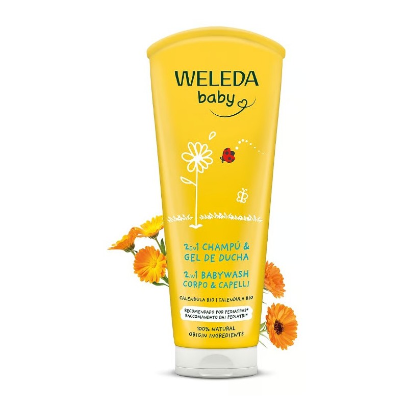 Weleda Champú y Gel de Ducha de Caléndula es un producto 2 en 1 especialmente formulado para la limpieza suave del cabello y la piel del bebé. Gracias a su fórmula sin jabón y a sus ingredientes de origen natural y BIO, este cuidado diario proporciona una higiene segura y respetuosa incluso con las pieles más sensibles. Su composición rica en aceite de almendra dulce, aceite de sésamo y extracto de caléndula protege la piel frente a la sequedad, mantiene su hidratación natural y deja el cabello suave, sedoso y muy fácil de peinar.