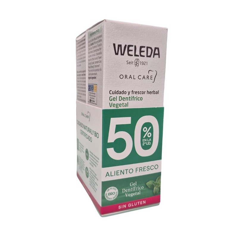 Weleda Gel Dentífrico Vegetal Duplo es un gel dental 100% natural que limpia suavemente el esmalte, previene la placa bacteriana y proporciona un aliento fresco gracias a la menta y la hierbabuena. Su fórmula vegetal, con extractos de ratania, mirra y manzanilla, cuida las encías y es apta también para niños con dientes definitivos. Ideal para quienes buscan una higiene bucal suave, eficaz y sin gluten.