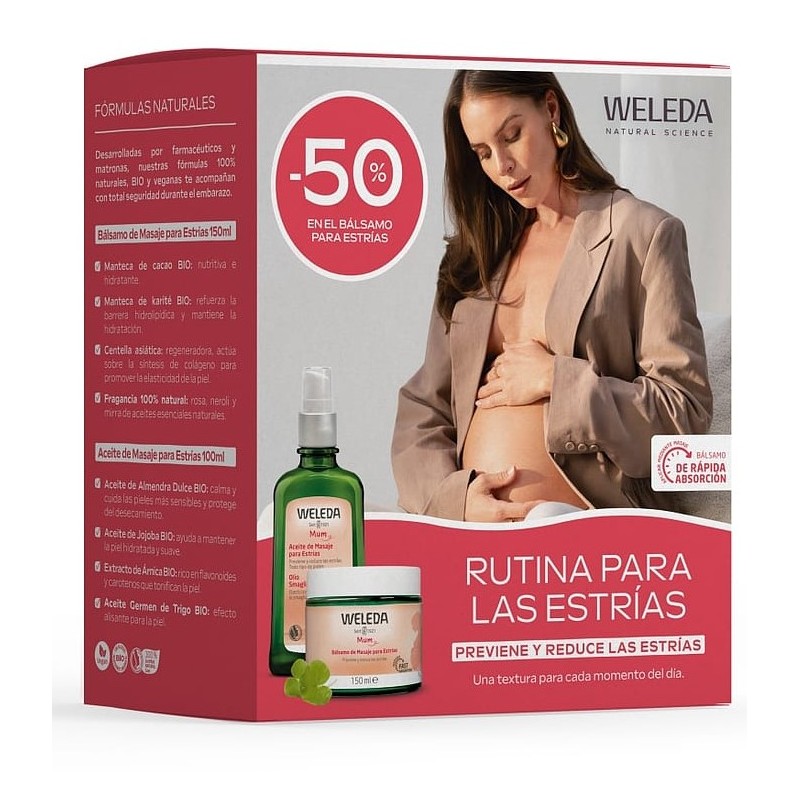Weleda Dúo Rutina de Masaje para Estrías es un pack especialmente diseñado para el cuidado de la piel durante el embarazo y en etapas en las que el cuerpo experimenta cambios, como la adolescencia o variaciones de peso. Este dúo combina dos texturas complementarias —bálsamo de masaje y aceite natural— que trabajan en sinergia para prevenir la aparición de estrías y reducir la visibilidad de las ya existentes.