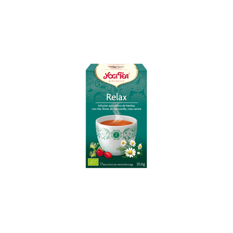YOGI TEA® Relax es una infusión ayurvédica de hierbas con Tila, Flores de Manzanilla y Rosa Canina.