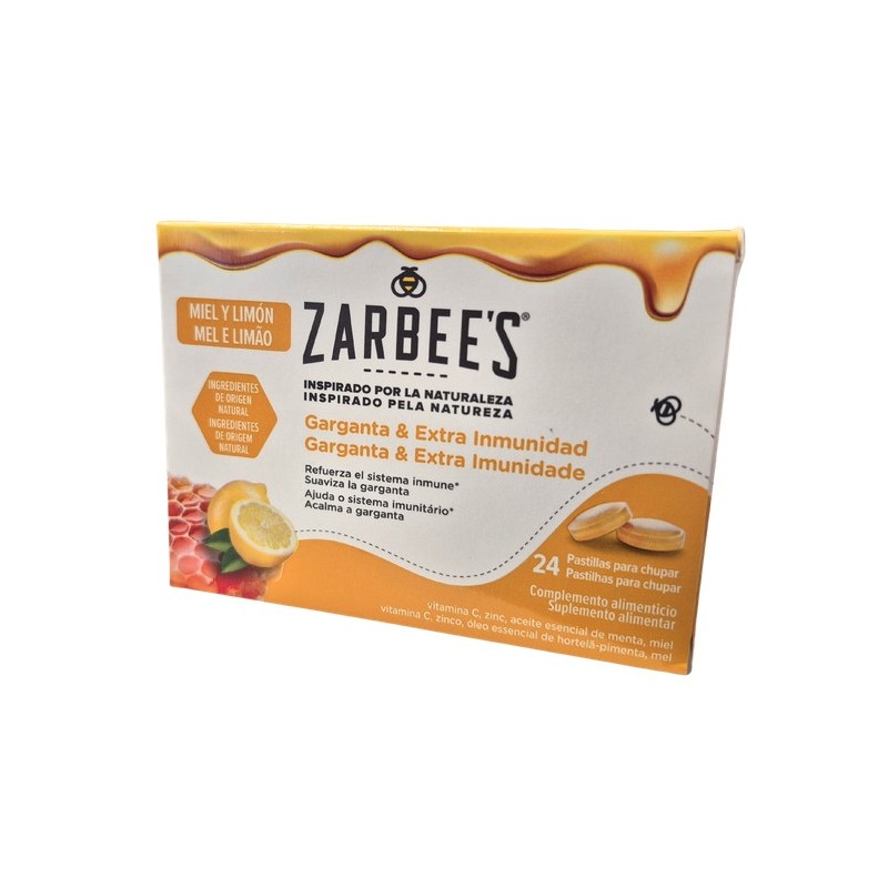 Zarbees Pastillas Sabor Miel y Limón son un complemento alimenticio formulado con ingredientes de origen natural cuidadosamente seleccionados, que combinan la suavidad de la miel, la frescura del limón y el efecto balsámico del aceite esencial de menta. Gracias a su aporte de vitamina C y zinc, estas pastillas contribuyen al funcionamiento normal del sistema inmunitario y a la protección frente al estrés oxidativo.