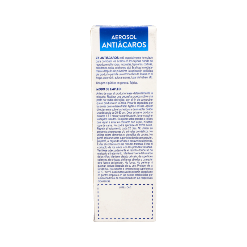 ZZ Aerosol Antiácaros es un producto especialmente diseñado para combatir los ácaros en los tejidos donde tienden a reproducirse, como alfombras, moquetas, tapicerías, cortinas, edredones, sofás y colchones.