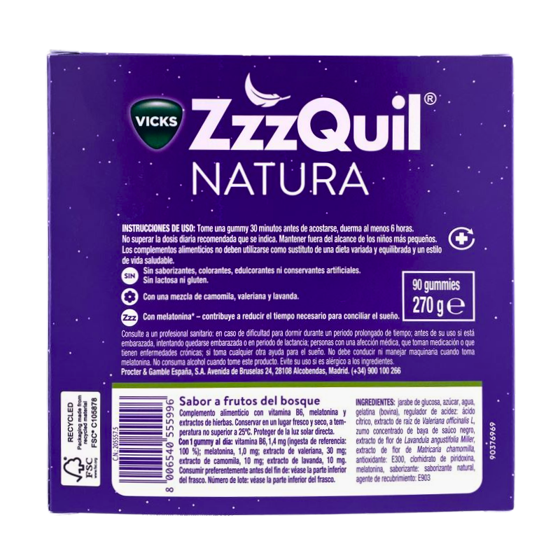 ZzzQuil Natura Sabor Frutas del Bosque Gummies son unos deliciosos suplementos en formato de gomitas diseñados para favorecer un sueño tranquilo y reparador.
