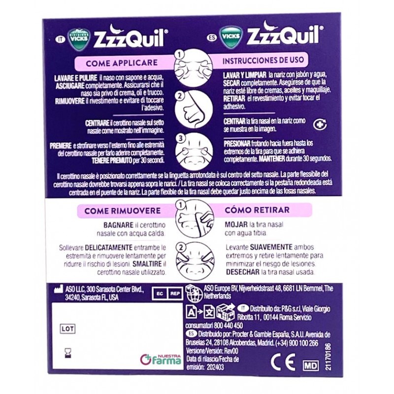 ZzzQuil Sueño Tiras Nasales es un producto diseñado para mejorar la respiración y, como consecuencia, la calidad del sueño. Estas tiras nasales flexibles se colocan sobre el puente de la nariz y ayudan a abrir las fosas nasales de manera instantánea, aliviando la congestión nasal causada por alergias, resfriados o el tabique desviado. Al mejorar la respiración, también reduce los ronquidos y facilita un descanso más profundo y reparador. Las tiras cuentan con cuatro puntos de apoyo que aseguran su efectividad y comodidad durante la noche.